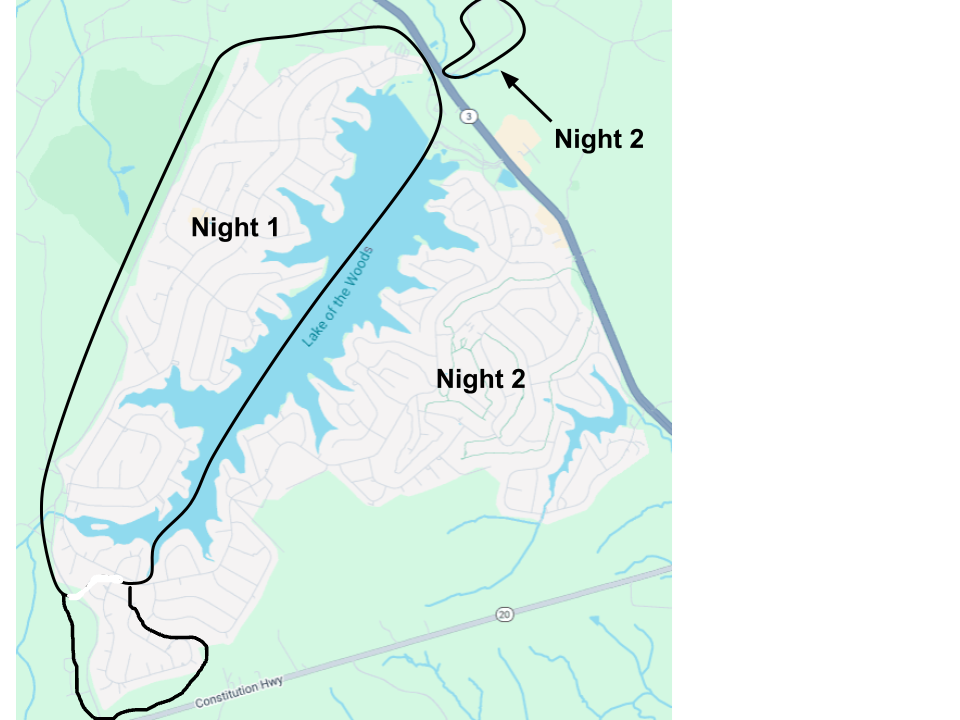 - Night 2 – Saturday, Dec. 13, starting about 5 PM, from Confederate Drive to the Front Gate on the golf course side then to the Sheetz and Food Lion. A stop off at Rapidan Rd, then final stop at Walmart for the evening.